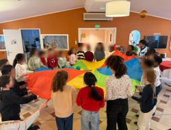 Pour clôturer la séance, un jeu de parachute a été proposé… et quel succès ! Les enfants ont immédiatement adoré, émerveillés par les couleurs et les mouvements du tissu. Faire voler le parachute, le lever, l’abaisser, faire rouler les balles : un moment de coopération, de joie et de rires collectifs qui restera gravé dans les mémoires.