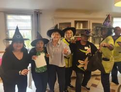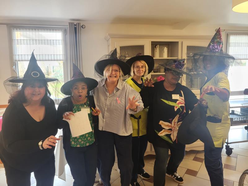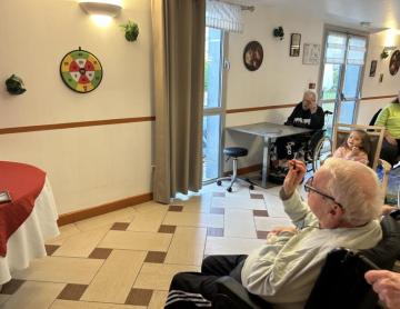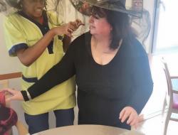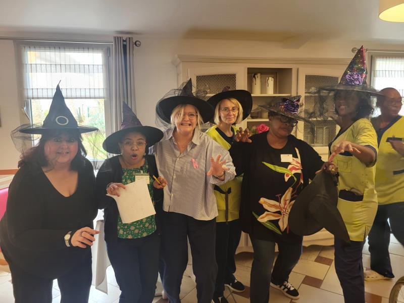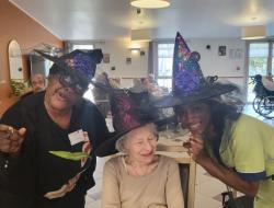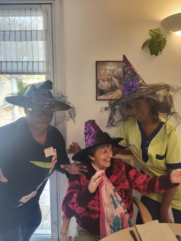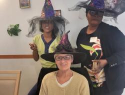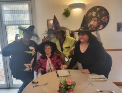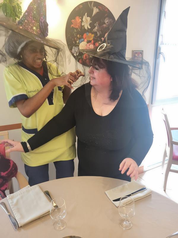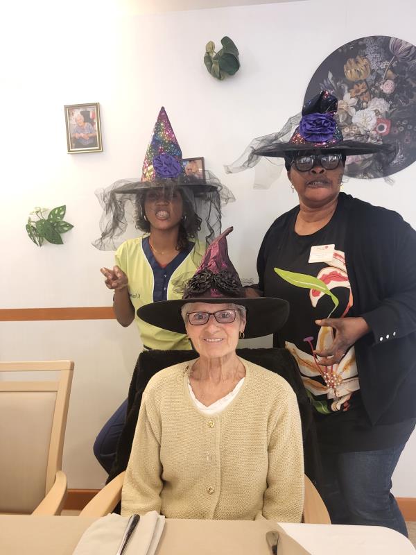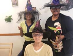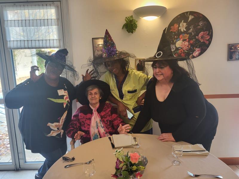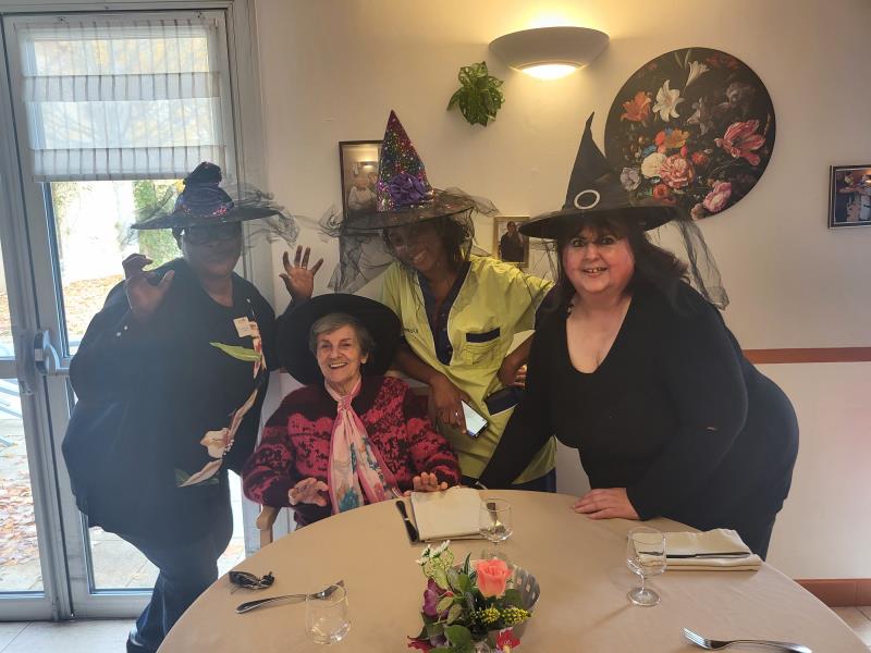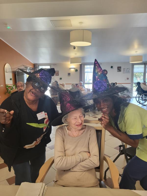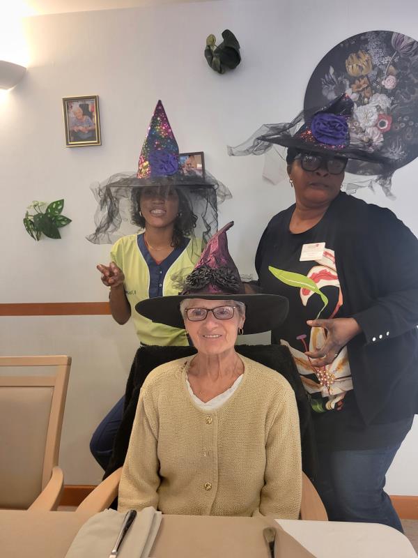 L’animatrice, l’équipe et plusieurs résidents se sont prêtés au jeu du déguisement, en portant de charmants chapeaux pour l’occasion.