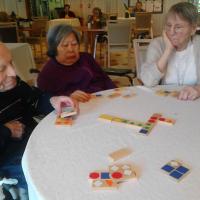 Publiée le 02/05/2019Cet après midi, avec les résidents, nous avons fait des jeux de société : Dominos couleurs et formes ; Triominos noir avec chiffres blancs. Divertissement et sourire assurés ! Nous souhaitions, à travers cette activité, favoriser le lien social et les échanges entre les ré [...] Lire la suite