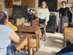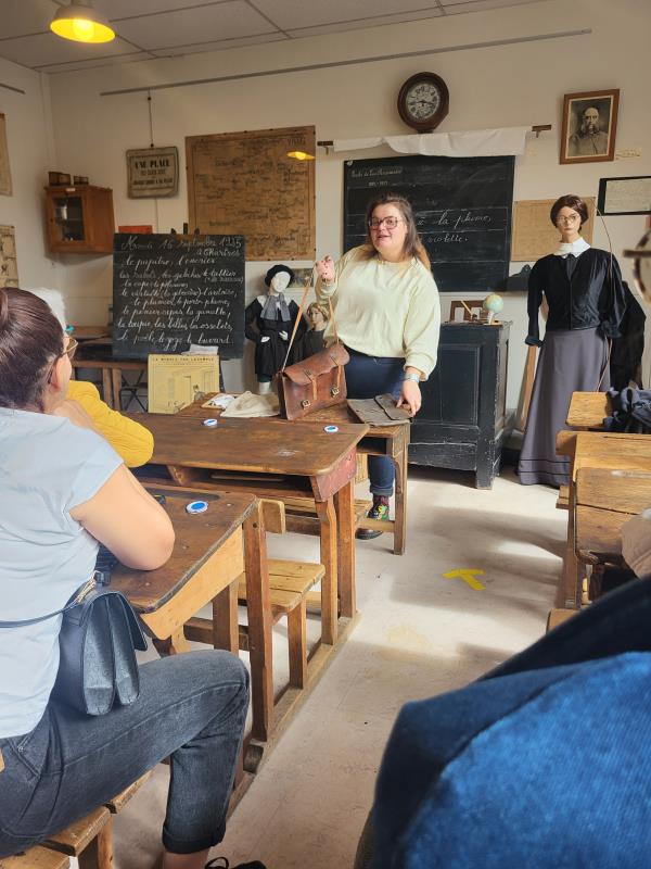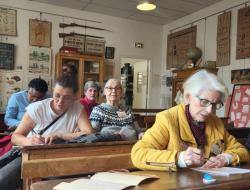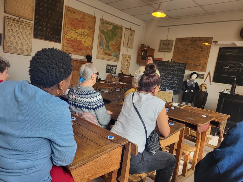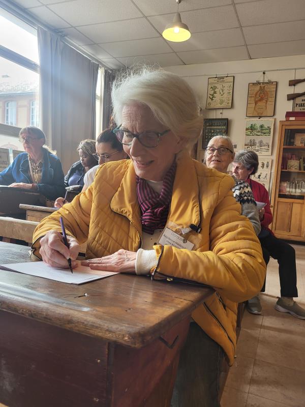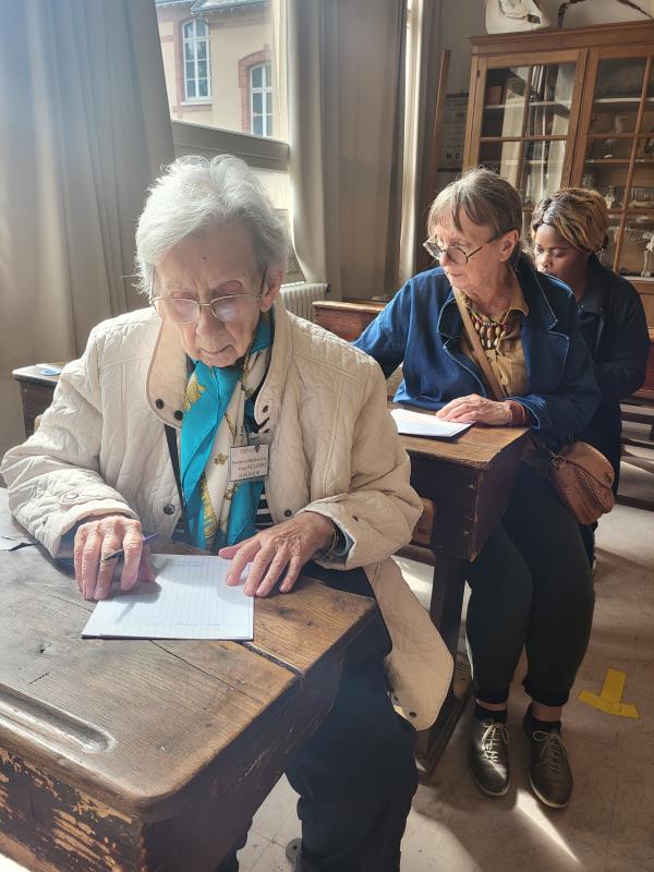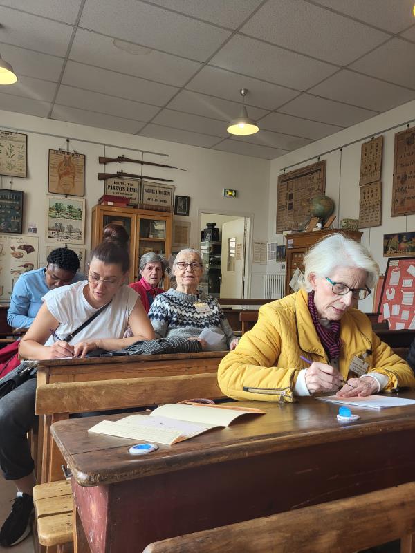 L’après-midi, nous avons visité une école ancienne, reconstituée comme à l’époque. Les résidents ont pu découvrir (ou redécouvrir) comment se déroulait la vie scolaire autrefois : les élèves portaient un uniforme, écrivaient à la plume avec de l’encre, et suivaient des règles très strictes. Cette immersion dans le passé a éveillé de nombreux souvenirs chez certains, qui ont partagé avec émotion leurs propres expériences d’écoliers.